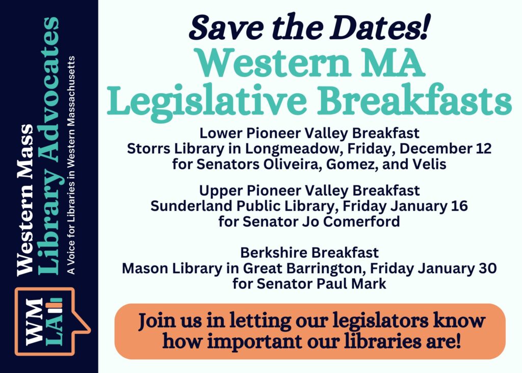 Sponsored by the Western Massachusetts Library Advocates and hosted by the Storrs Library, the Lower Pioneer Valley Legislative Breakfast will bring together legislators and library advocates from the communities represented by Senators Jacob Oliveira, Adam Gomez, and John Velis.